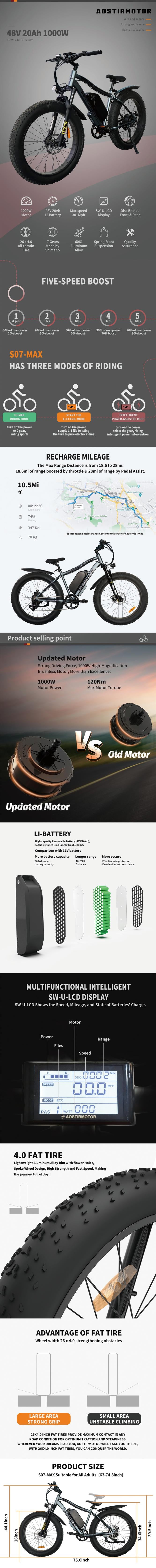 【1000W Motor With Strong Power】 1000W motor, strong driving force, removable 48V 20Ah lithium battery. It can ride 25-35km in pure electric mode.Load capacity: 300LBS.