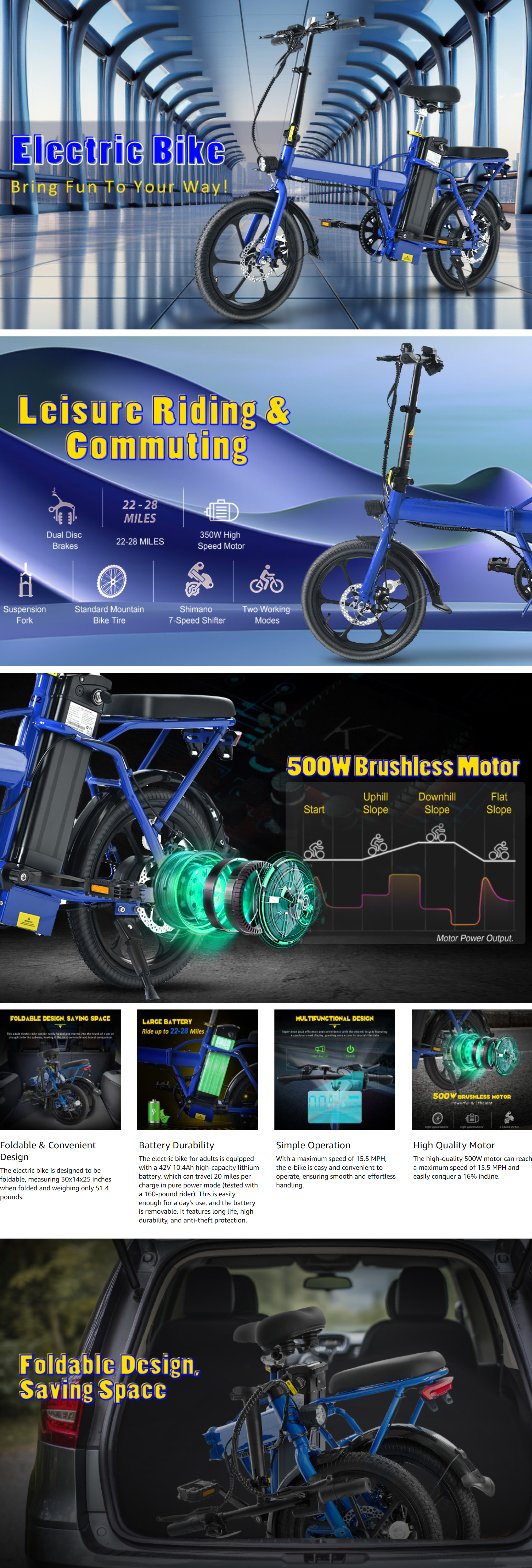 【High Quality Motor & Battery Durability】 The electric bike for adults is equipped with a 42V 10.4Ah high capacity lithium battery, can travel 20miles per charge in pure power mode (Volunteer weighs 160 pounds), easily enough for your day's use, and is removable The battery has the characteristics of long life, high durability, anti-theft and convenience. The high-quality 500W motor can reach a maximum speed of 15.5MPH, which can easily conquer 16% slope.